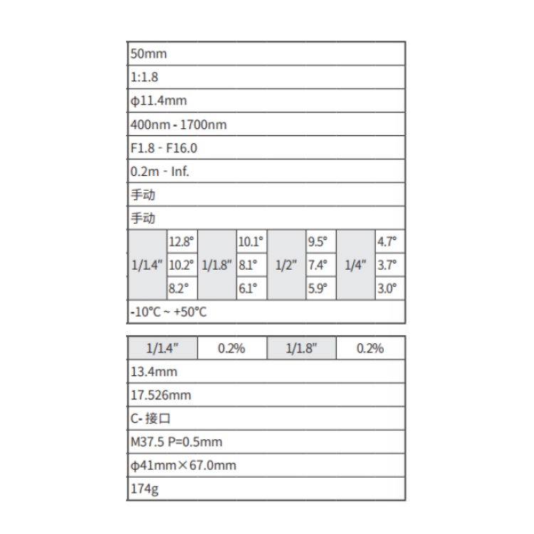视角:对角:1/1.4:12.8° ;1/1.8:10.1°; 1/2: 9.5°;1/4:4.7°;