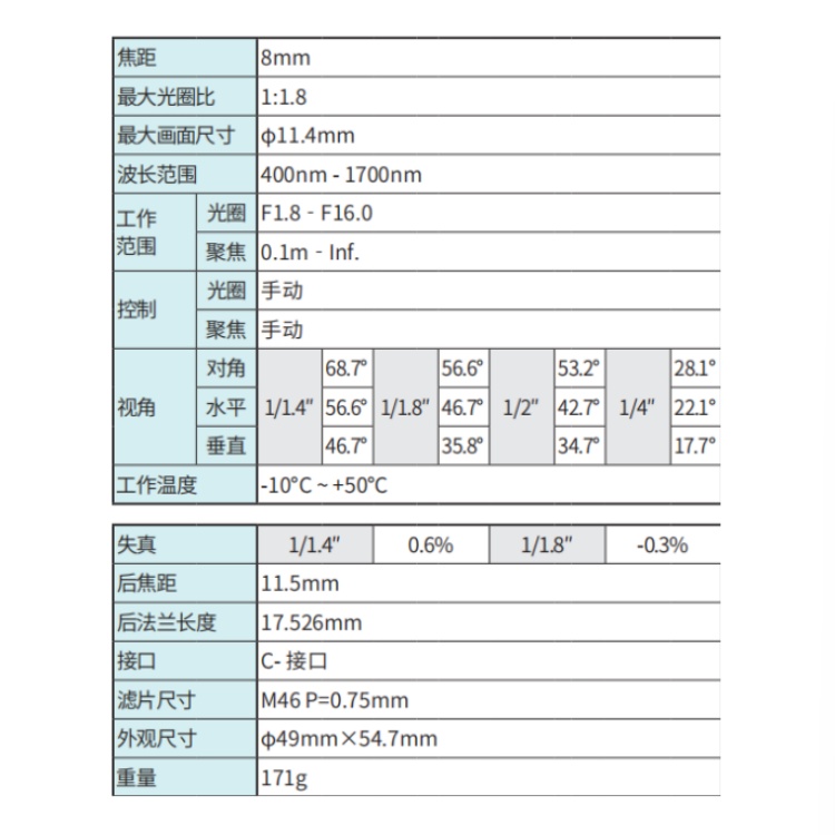 视角:对角:1/1.4:68.7° ;1/1.8:56.6°; 1/2: 53.2°;1/4:28.1°;