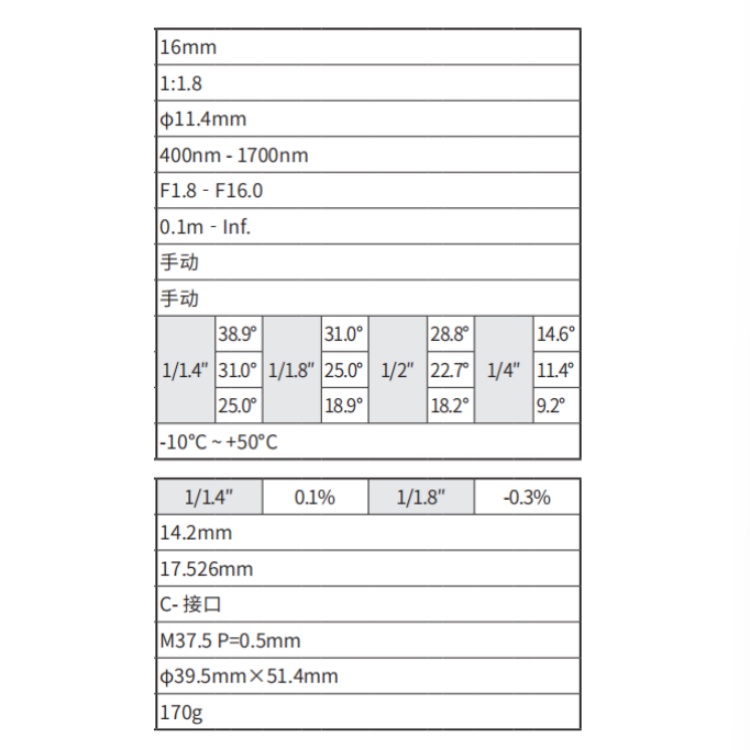 视角:对角:1/1.4:38.9° ;1/1.8:31.0°; 1/2: 28.8°;1/4:14.6°;
