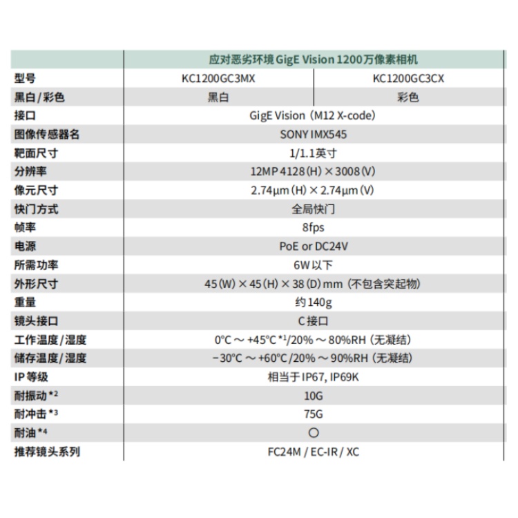 KC1200GC3MX KOWA 1200万1/1.1英寸千兆网口恶劣环境相机 原装日本科瓦相机 黑白/彩色可选 SONY IMX545 全局快门8fps GigE Vision(M12 X-code) 耐振动和耐冲击 应对恶劣环境 分辨率4128(H)×3008(V)像元2.74µm(H)×2.74µm(V)供电PoE or DC24V 镜头接口C接口 相当于 IP67, IP69K 重量约140g KC1200GC3CX